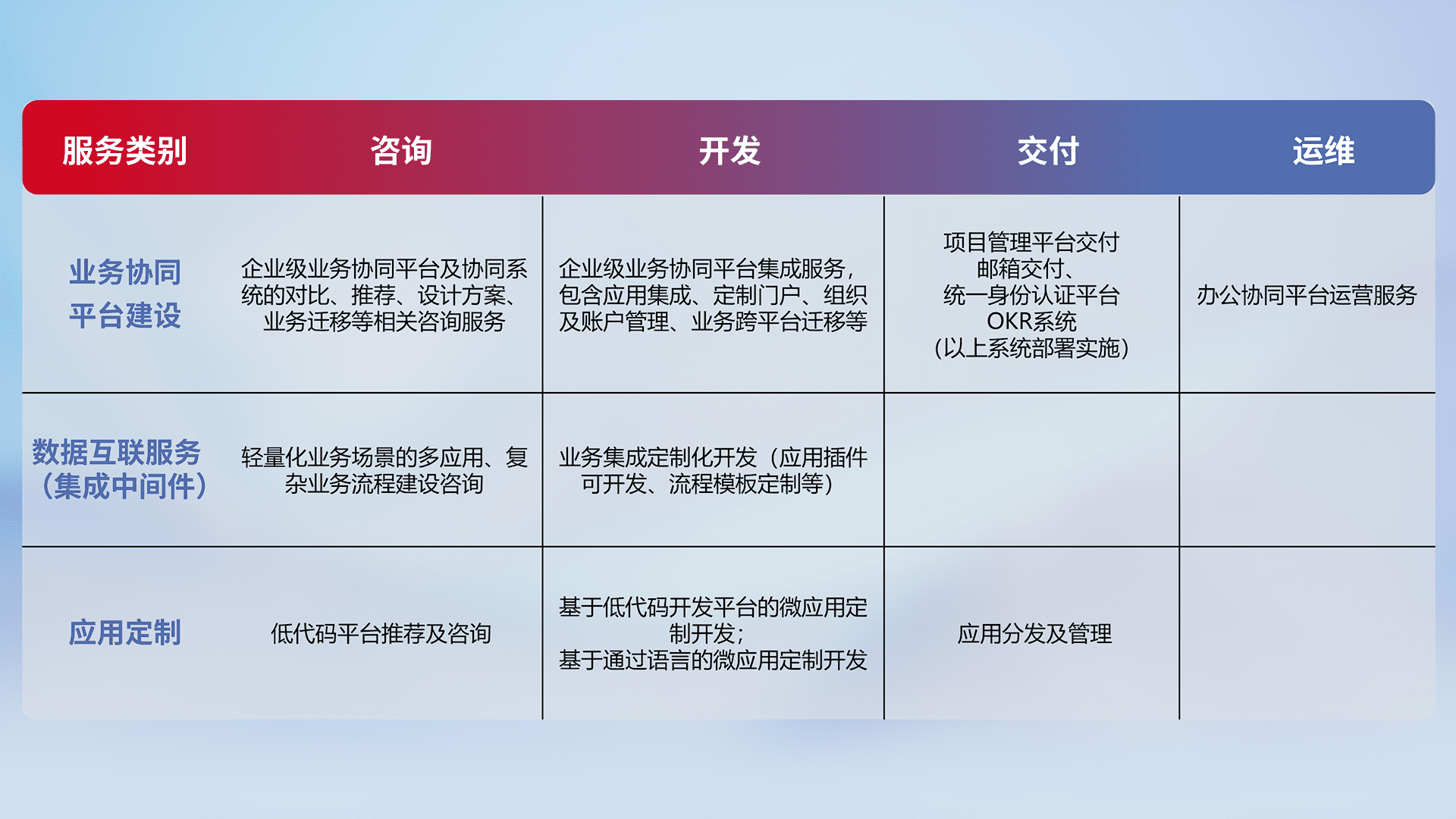 针对钉钉、、、企微、、、、IDaas等平台级产品提供产品的规划、、、方案、、交付、、定制化开发等服务,,,实现如统一协同办公、、、智能客户服务、、、混合会议管理、、、智能数据查询、、等业务场景,,实现数字化转型。。。。
