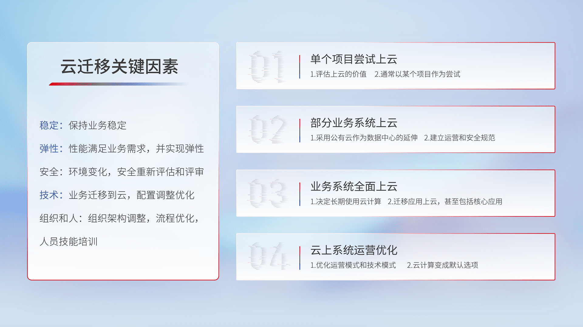 结合实际业务,,从规划设计、、、云平台选型、、、、云原生改造、、、数据迁移、、集成交付,,,,迁移全过程为客户识别最佳上云路径,,,,做好风险识别管理,,,,设计网络架构、、、身份权限、、、、安全审计合规、、操作审计、、日志审计、、、监控告警策略、、多站点容灾设计等,,,对云上基础设施进行整体规划,,,提升IT治理水平,,,,以满足弹性、、、高可用、、高性能的需求。。。
